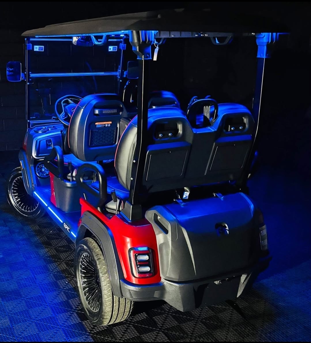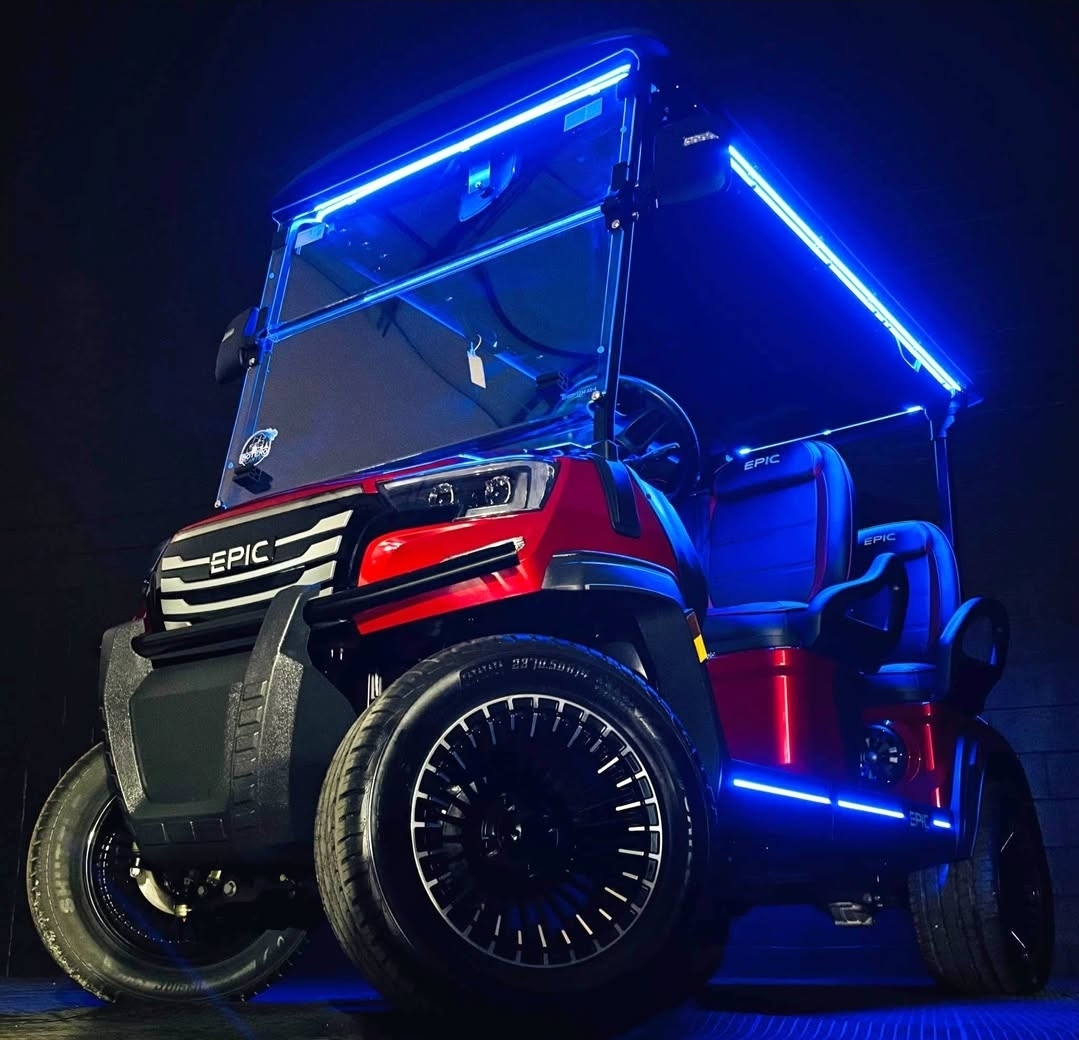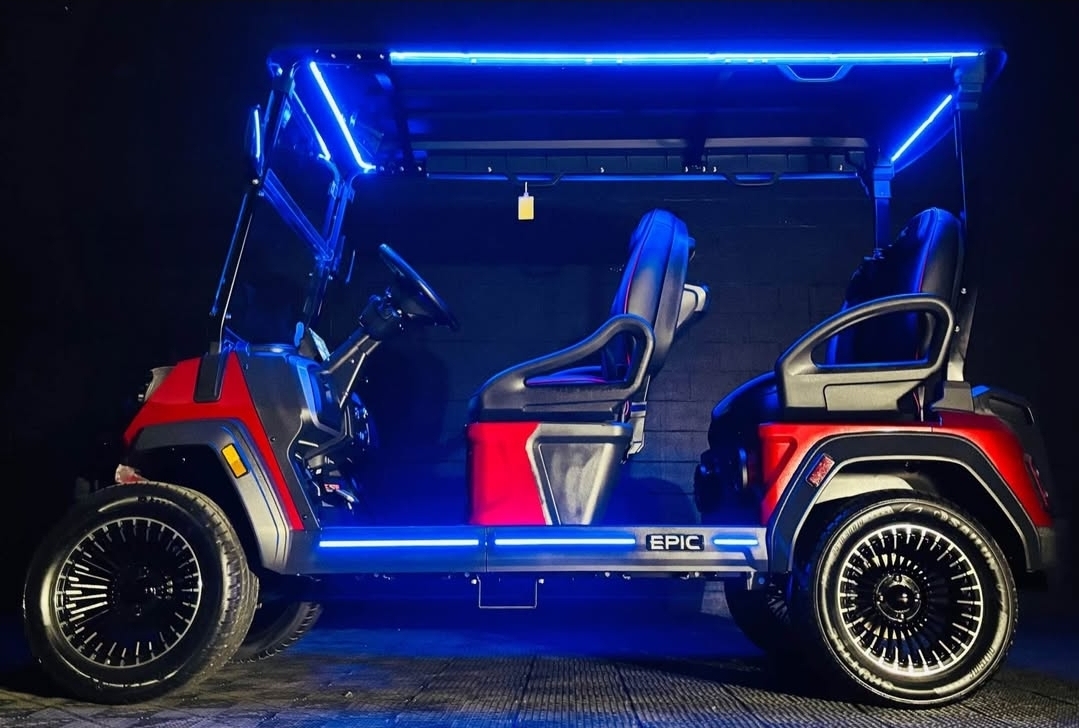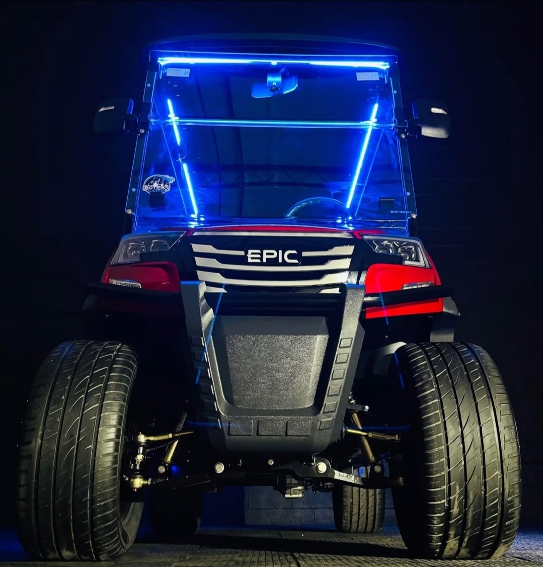 The brand new EPIC E40FX is the best golf cart on the market today! Furnished with every imaginable feature, the forward-facing four-seater EPIC E40FX comes in six stylish colors and two height options. Premium 14” wheels and street-ready tires provide a solid foundation for every journey on every terrain, no matter what lift height is selected. With an abundance of storage, superior built-in marine-grade sound system and speakers, and stunning accent lighting, this EPIC golf cart illuminates the possibilities for fun and adventure.