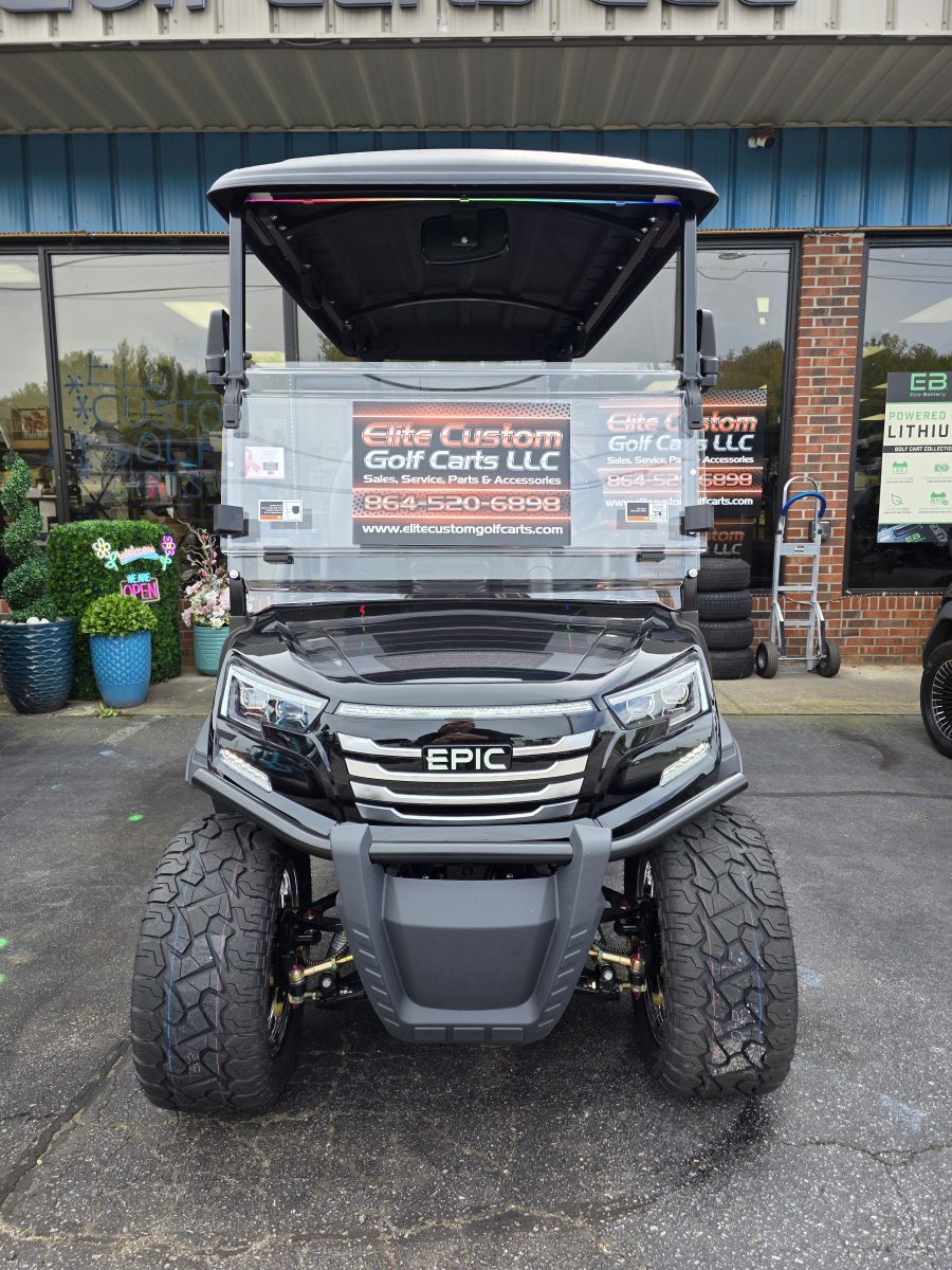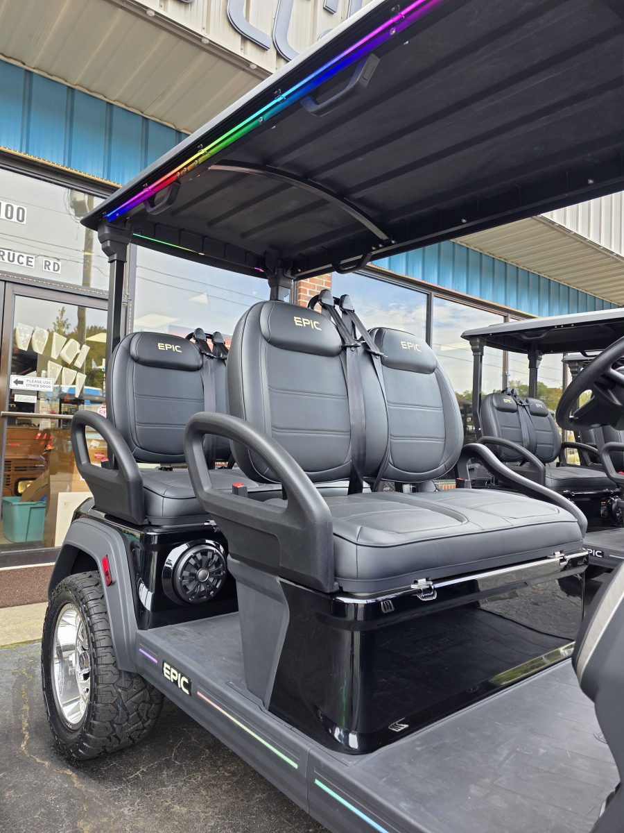 The brand new EPIC E40FX is the best golf cart on the market today! Furnished with every imaginable feature, the forward-facing four-seater EPIC E40FX comes in six stylish colors and two height options. Premium 14” wheels and street-ready tires provide a solid foundation for every journey on every terrain, no matter what lift height is selected. With an abundance of storage, superior built-in marine-grade sound system and speakers, and stunning accent lighting, this EPIC golf cart illuminates the possibilities for fun and adventure.