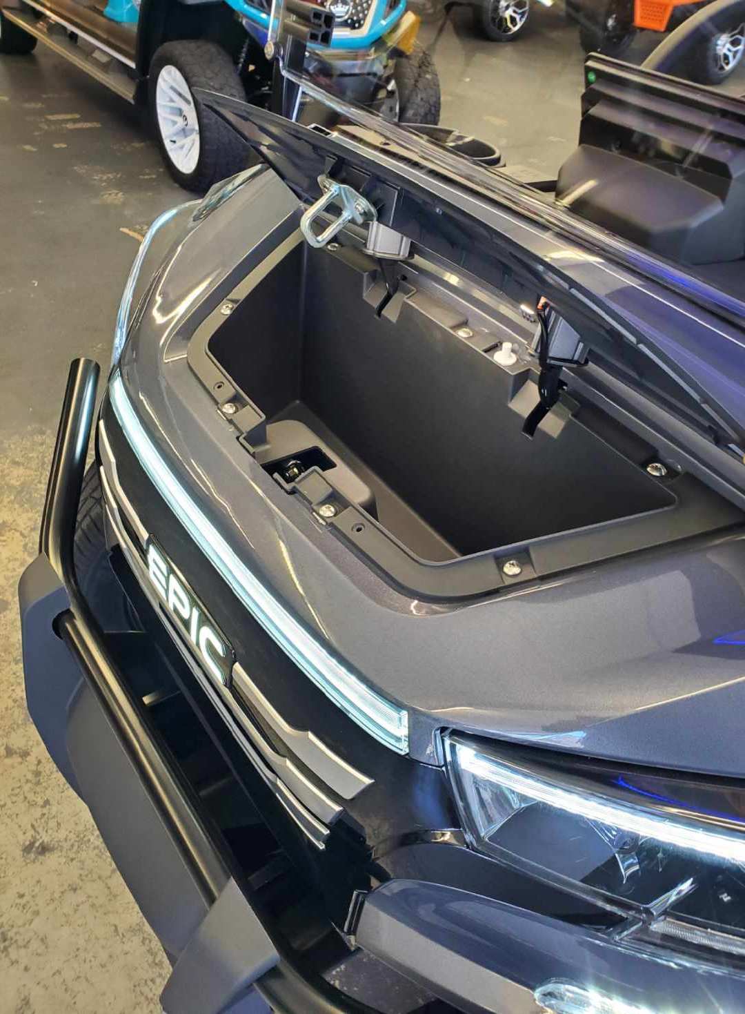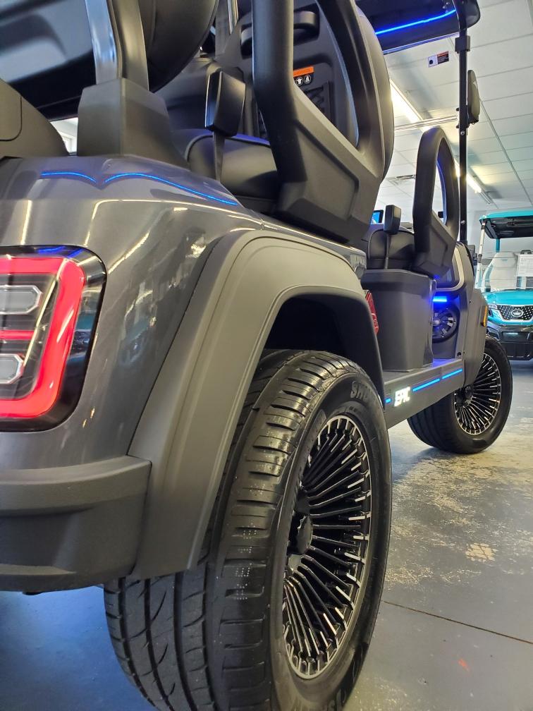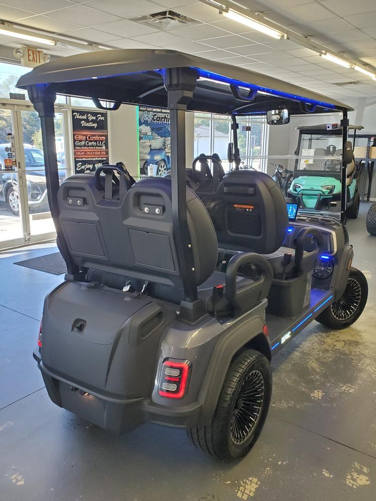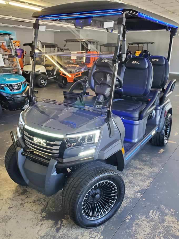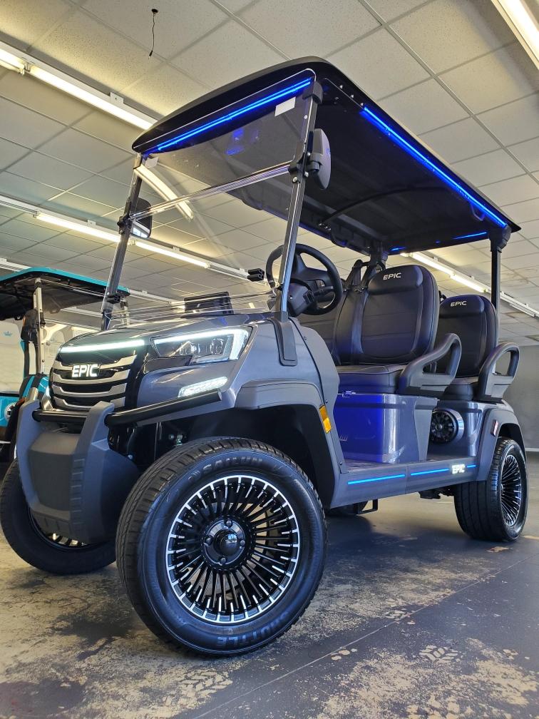 The brand new EPIC E40FX is the best golf cart on the market today! Furnished with every imaginable feature, the forward-facing four-seater EPIC E40FX comes in six stylish colors and two height options. Premium 14” wheels and street-ready tires provide a solid foundation for every journey on every terrain, no matter what lift height is selected. With an abundance of storage, superior built-in marine-grade sound system and speakers, and stunning accent lighting, this EPIC golf cart illuminates the possibilities for fun and adventure.