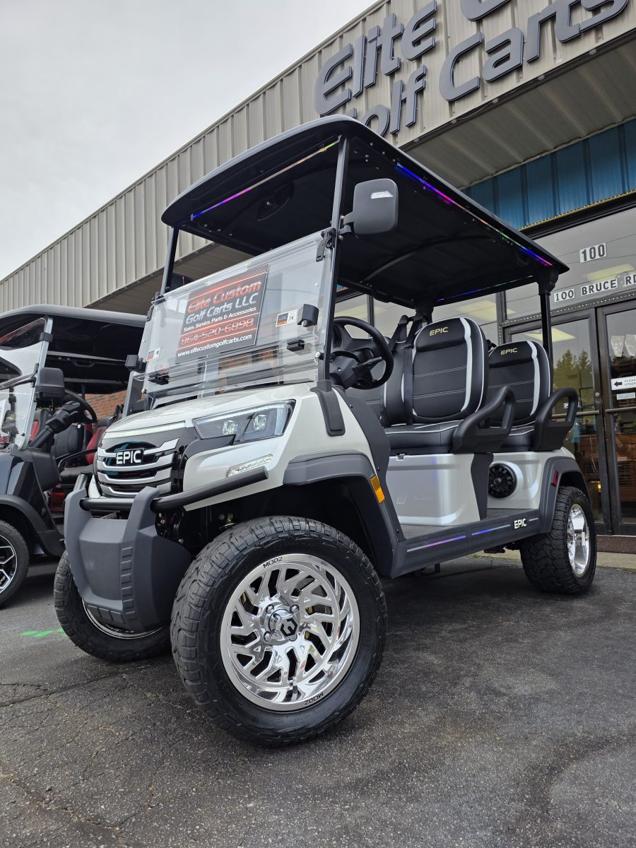 The brand new EPIC E40FX is the best golf cart on the market today! Furnished with every imaginable feature, the forward-facing four-seater EPIC E40FX comes in six stylish colors and two height options. Premium 14” wheels and street-ready tires provide a solid foundation for every journey on every terrain, no matter what lift height is selected. With an abundance of storage, superior built-in marine-grade sound system and speakers, and stunning accent lighting, this EPIC golf cart illuminates the possibilities for fun and adventure.