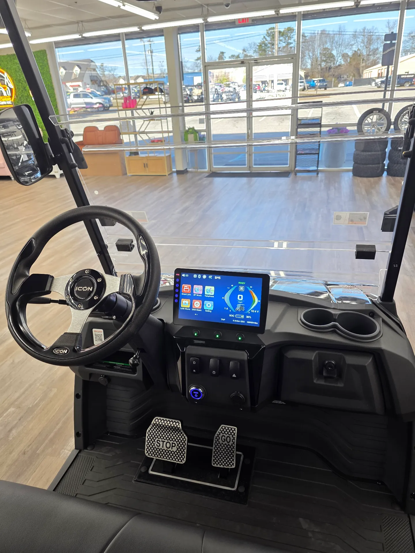 The 2026 Icon EV i60LX features a 48V ICON 5kW 3 Phase High Torque Motor, a 51V/105Ah ECO Lithium Battery, and a 450A ICON Controller. It also includes four wheel disc brakes and a 14:1 High Speed Rear Axle.